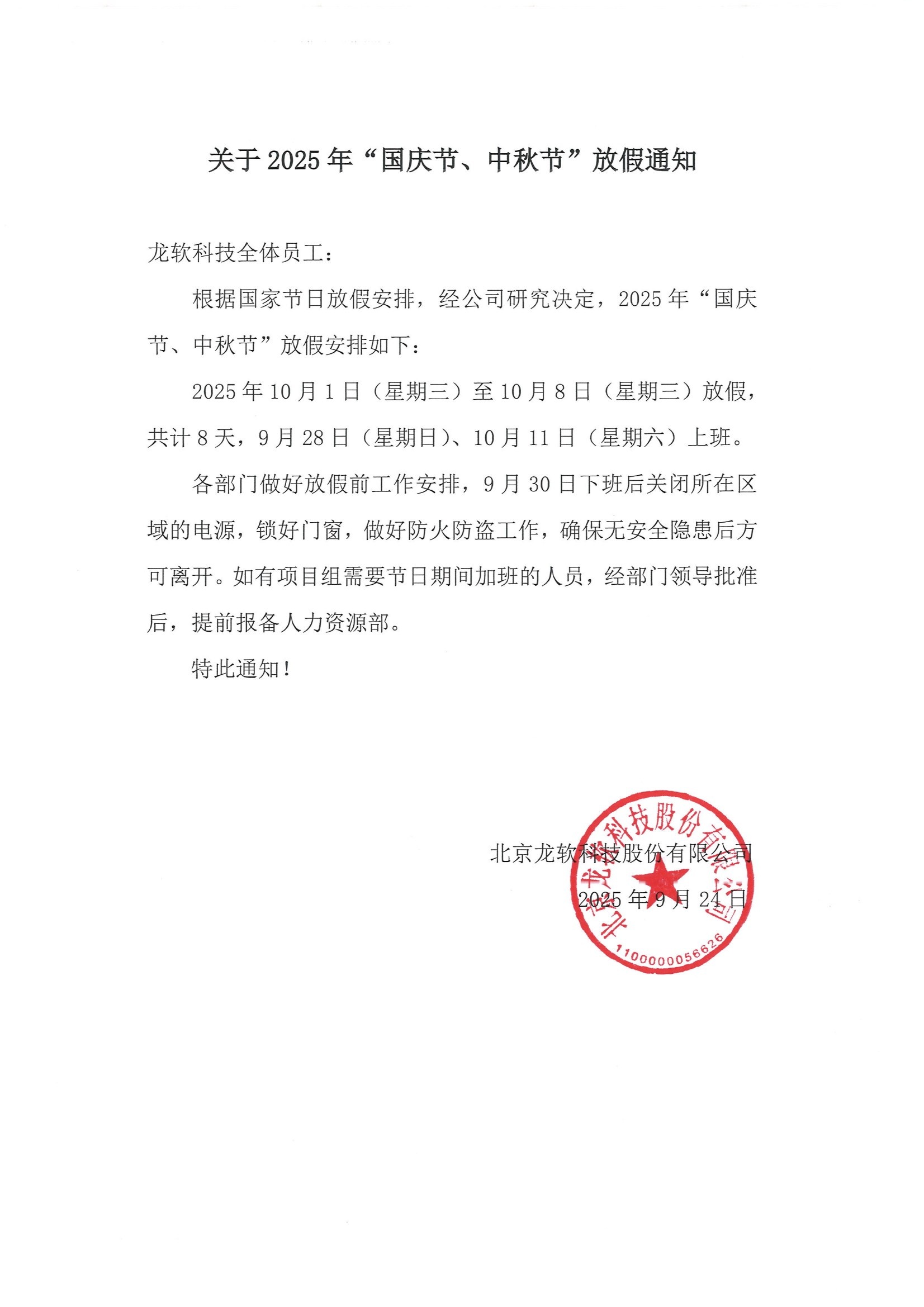 關(guān)于2025年“國慶節(jié)、中秋節(jié)”放假通知